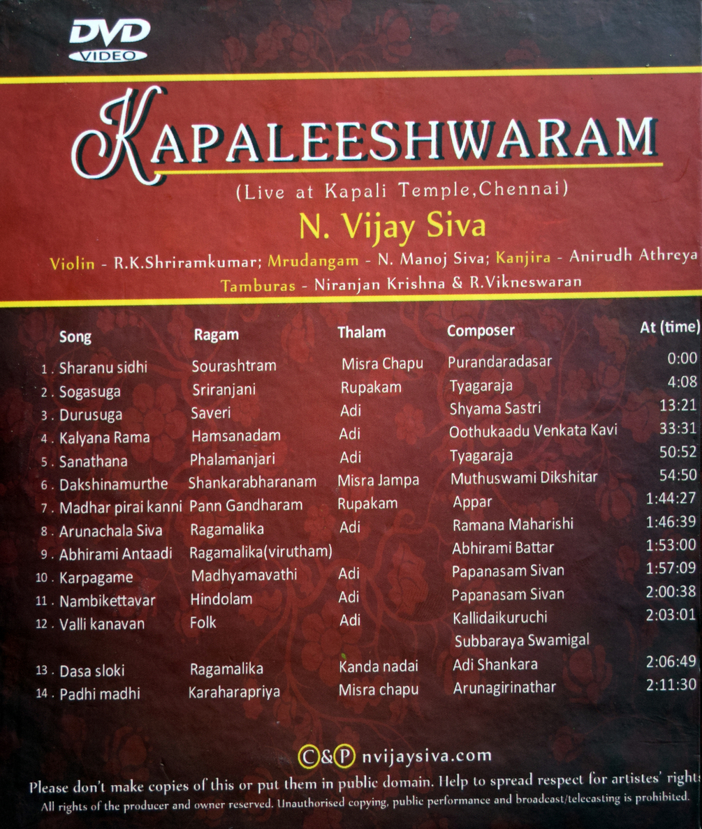 ‘Kapaleeshwaram’ is a live audio – video recording of Vijay Siva’s Concert at the Panguni festival (20th March 2014 ) of Kapaleeshwarar Temple, Chennai. With both the ambience and music being deeply traditional, it attempts to recapture the concert experience of about three hundred years ago.